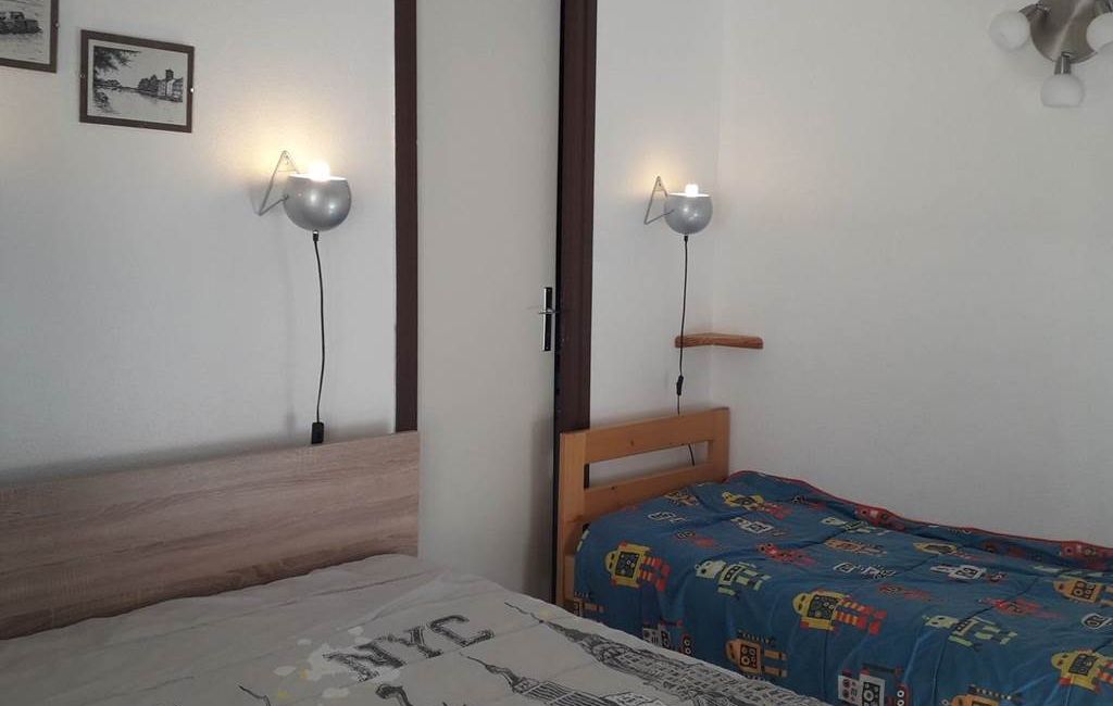 A south-facing bedroom separate from the living room, with a double bed (140cm) and a single bed.