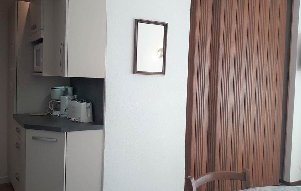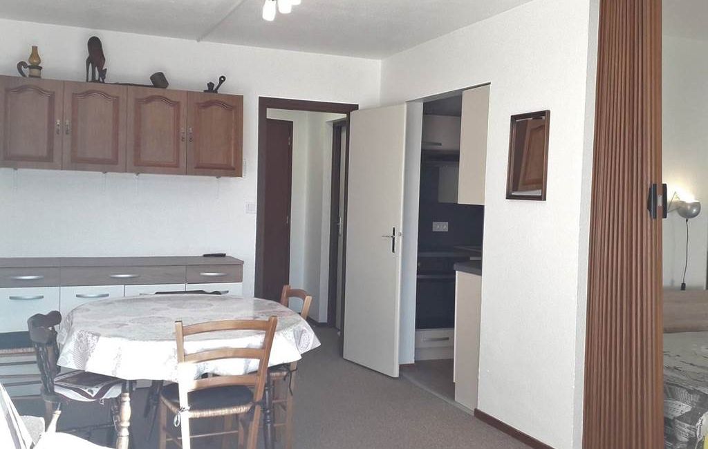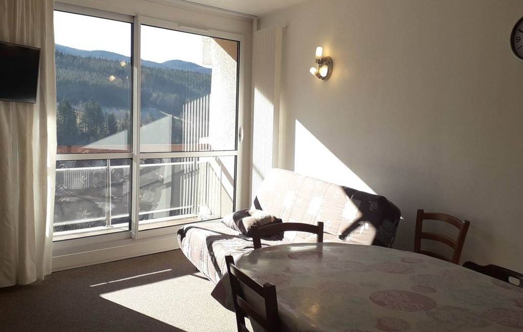 Entrance with cupboard. Living room opening onto a south-facing balcony with views of the slopes and mountains! The living room has a 2-seater sofa bed, TV, dining area and storage space.