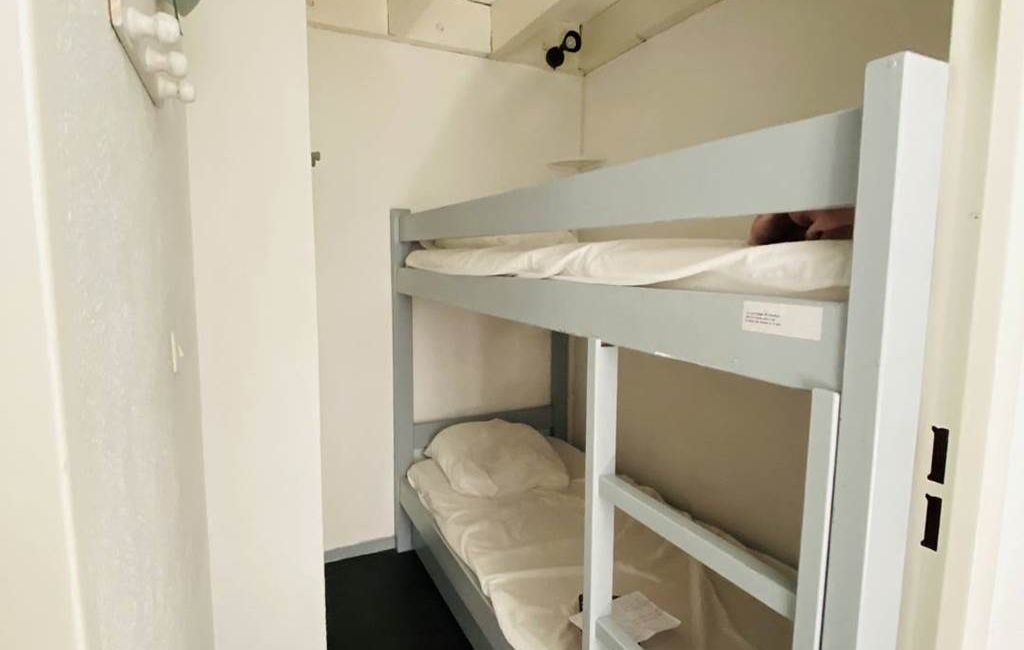 an entrance hall, a cabin with 2 bunk beds, a bright living room with sofa bed and access to a south-facing balcony, a fitted kitchenette, a bathroom and separate WC, a bedroom with 1 140 cm bed,