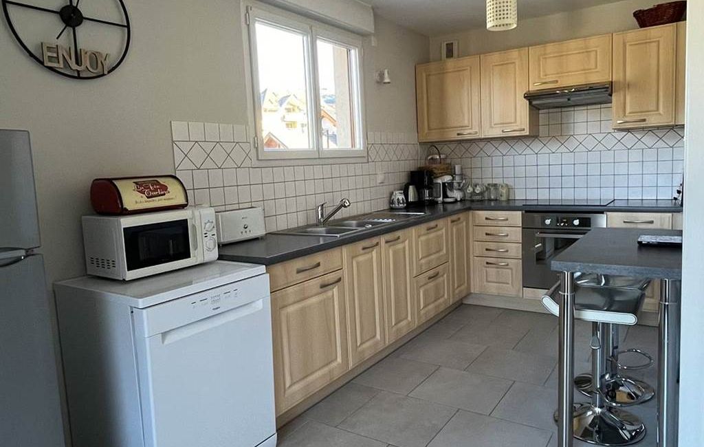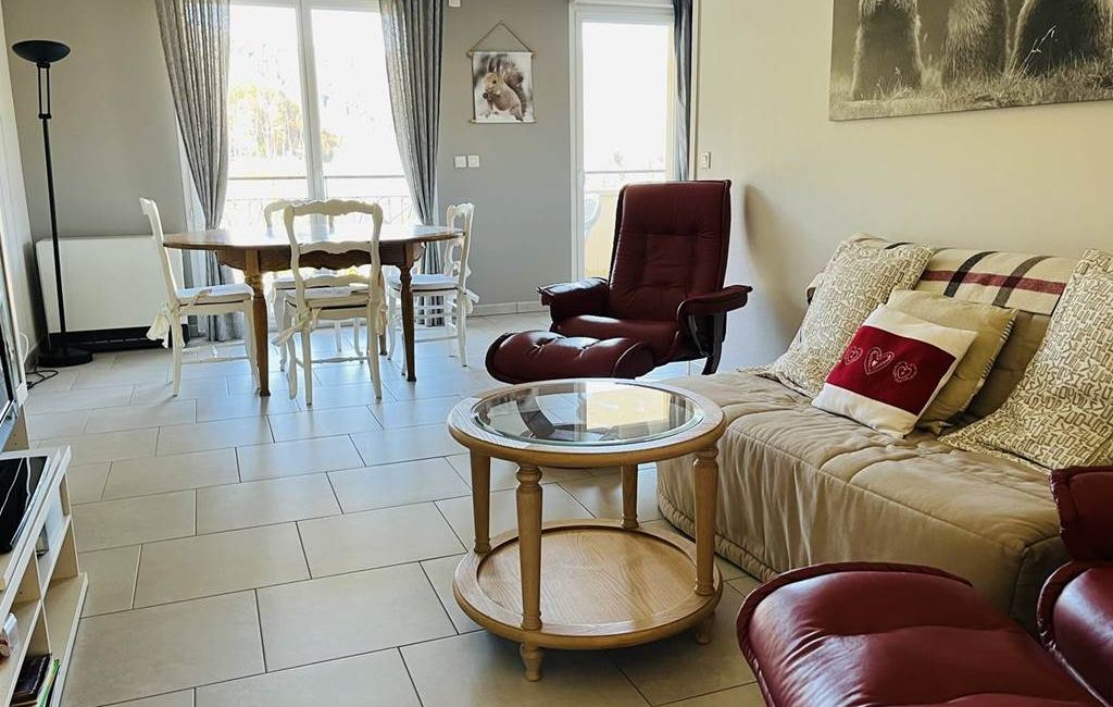 Entrance hall, bright living room opening onto a large 9 m2 west-facing balcony, fitted kitchen, shower room and separate toilet, two bedrooms with a 140 cm bed and a 160 cm bed, plenty of storage space, lift, intercom, basement garage.