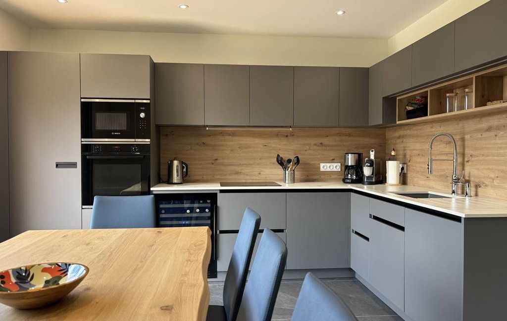 - Beautiful living room with fitted kitchen opening onto the lounge with pellet stove. The room has access to the south-west-facing terrace.