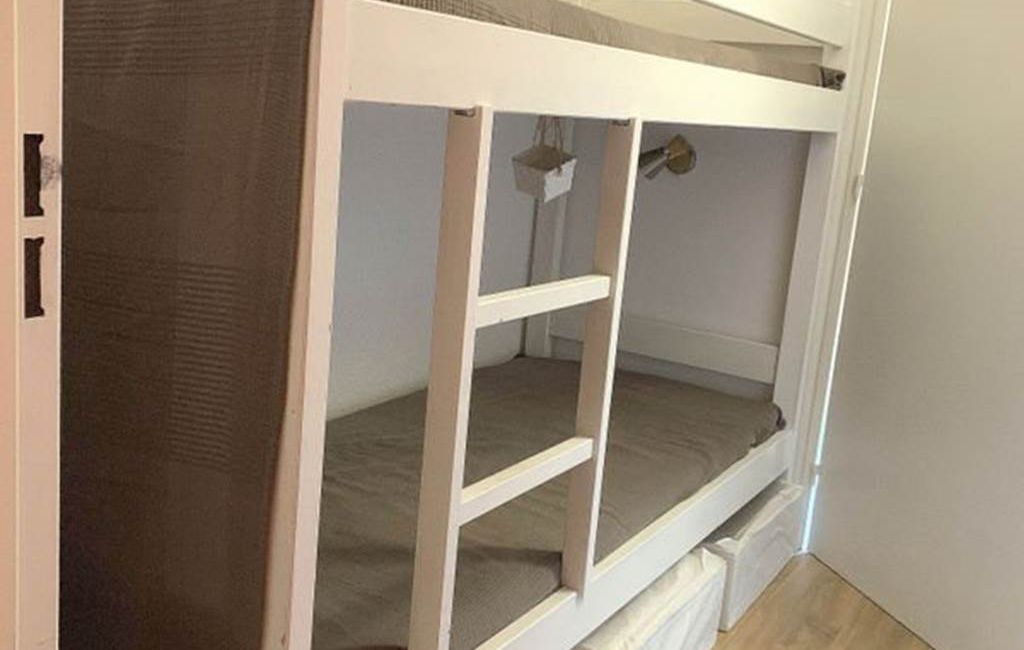 an entrance hall with 2 bunk beds, a fully-equipped kitchen area with dishwasher and washing machine, a living room with sofa bed and access to a south-facing balcony not overlooked, a bathroom with bath and WC.