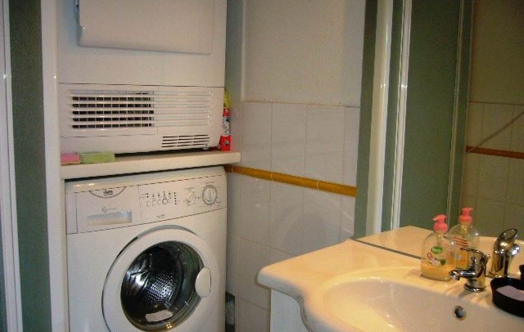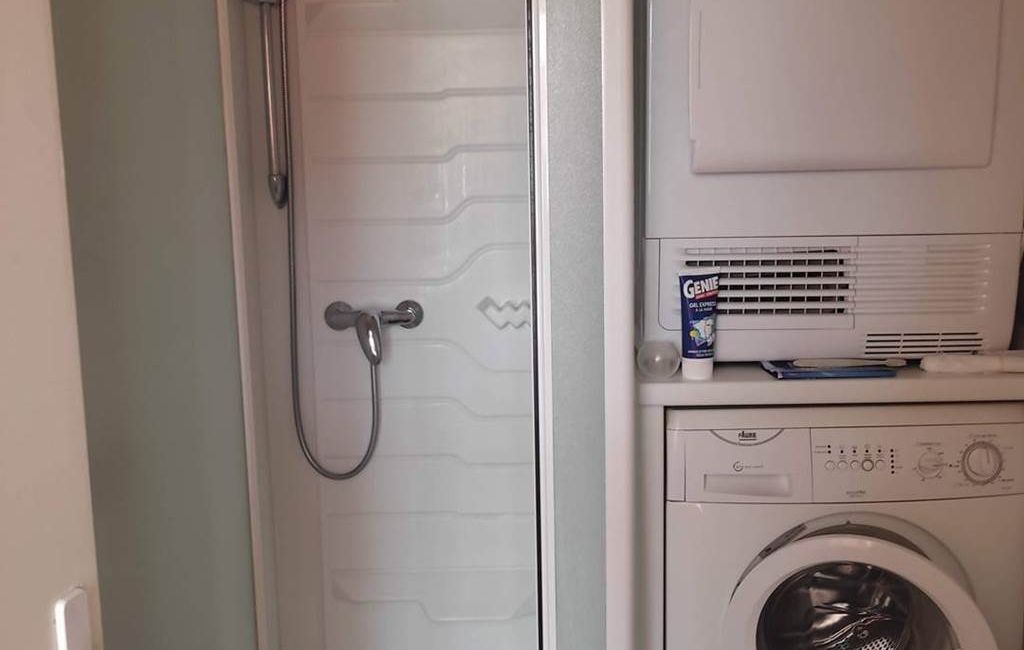 Bathroom with shower, baby bath, washing machine and tumble dryer.