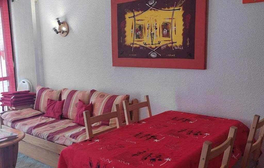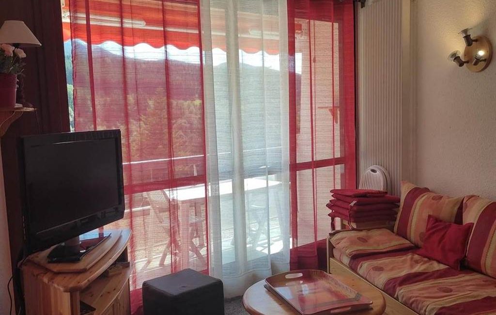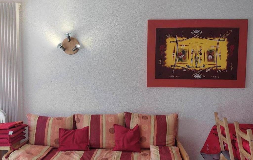 Living room with south-facing balcony, 2 sofa beds (4x80 cm), TV, DVD player, fibre box with numerous channels.