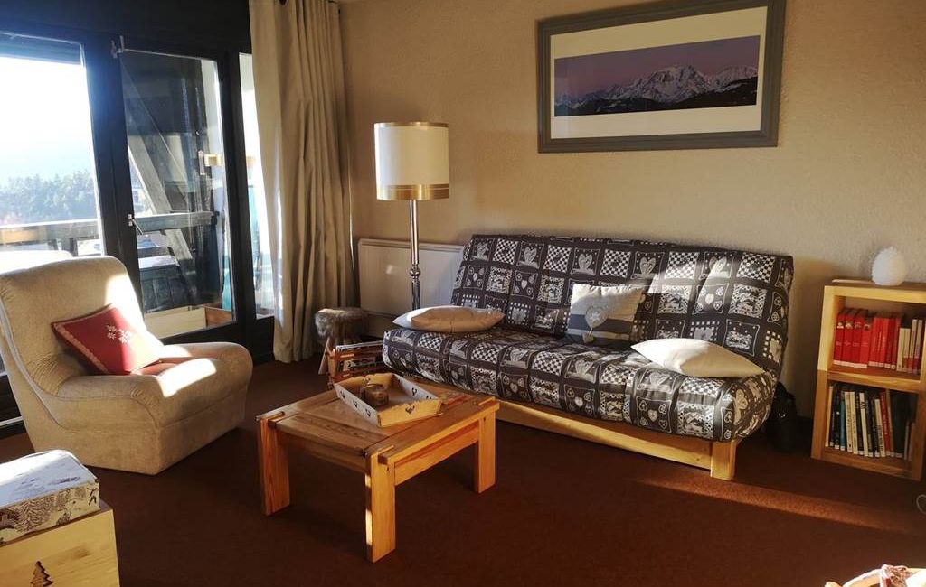 a spacious living room with access to a balcony with mountain views, with a click-clack.