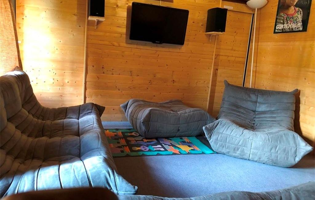1 mezzanine with relaxation area and TV, a bedroom with a 160 cm bed and 2 single beds.