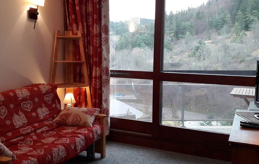 Living room: balcony with mountain views. Flat-screen TV, sofa bed for 2 people (140cm) and a single bed that folds down onto the wall.