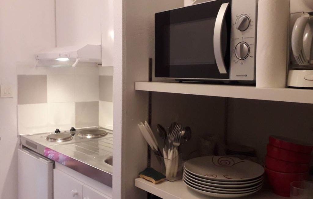 Kitchen area equipped with 2 hobs, fridge, microwave, filter coffee maker, raclette machine.