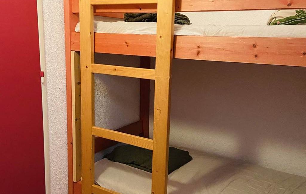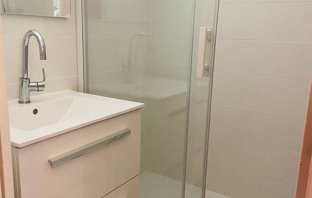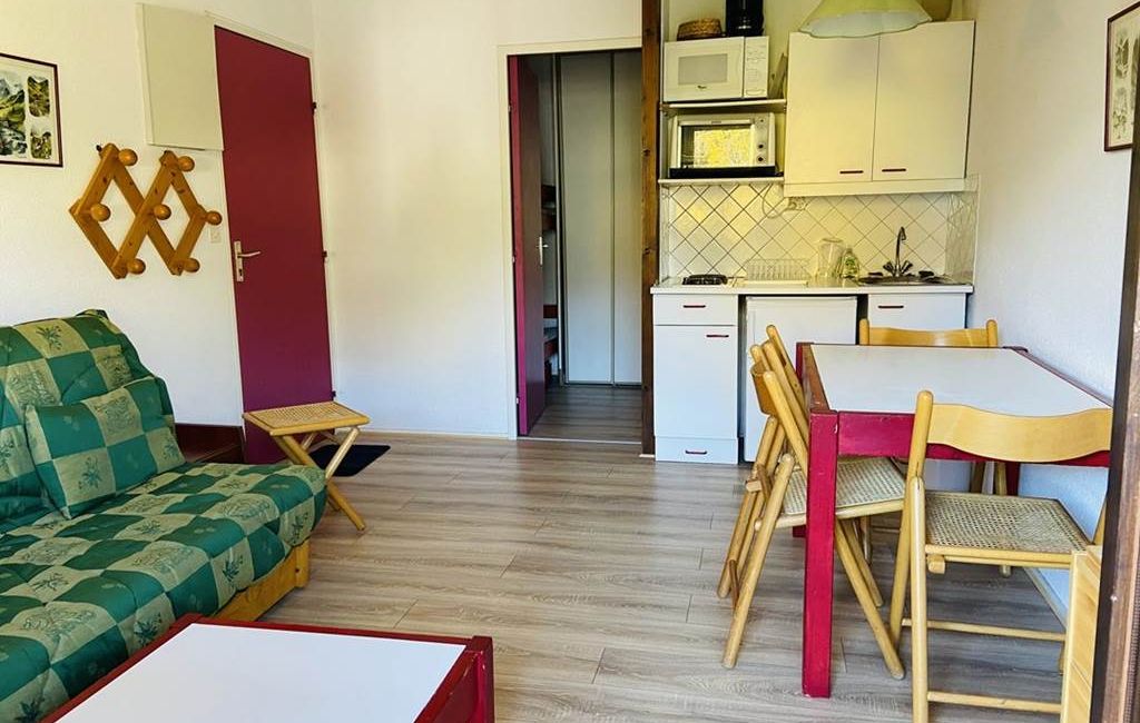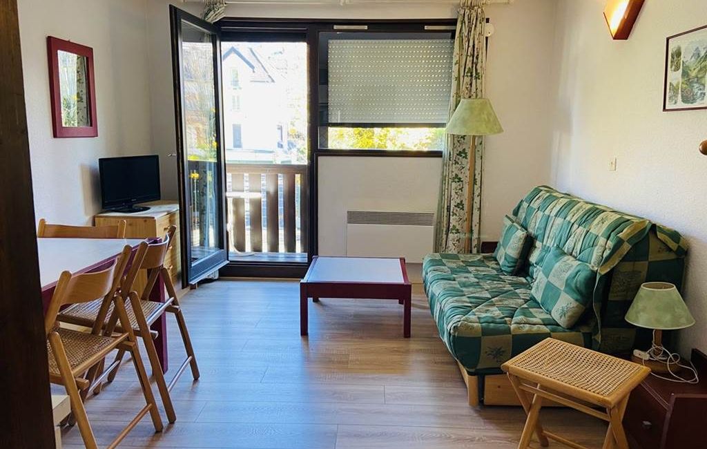 living room with sofa bed, east-facing balcony access, kitchenette, renovated shower room with WC, sleeping area with 2 bunk beds.