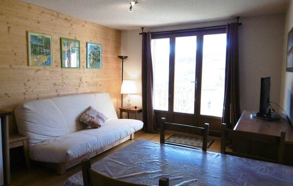 Living room with TV, 2-seater 140 sofa bed opening onto a south-facing balcony.